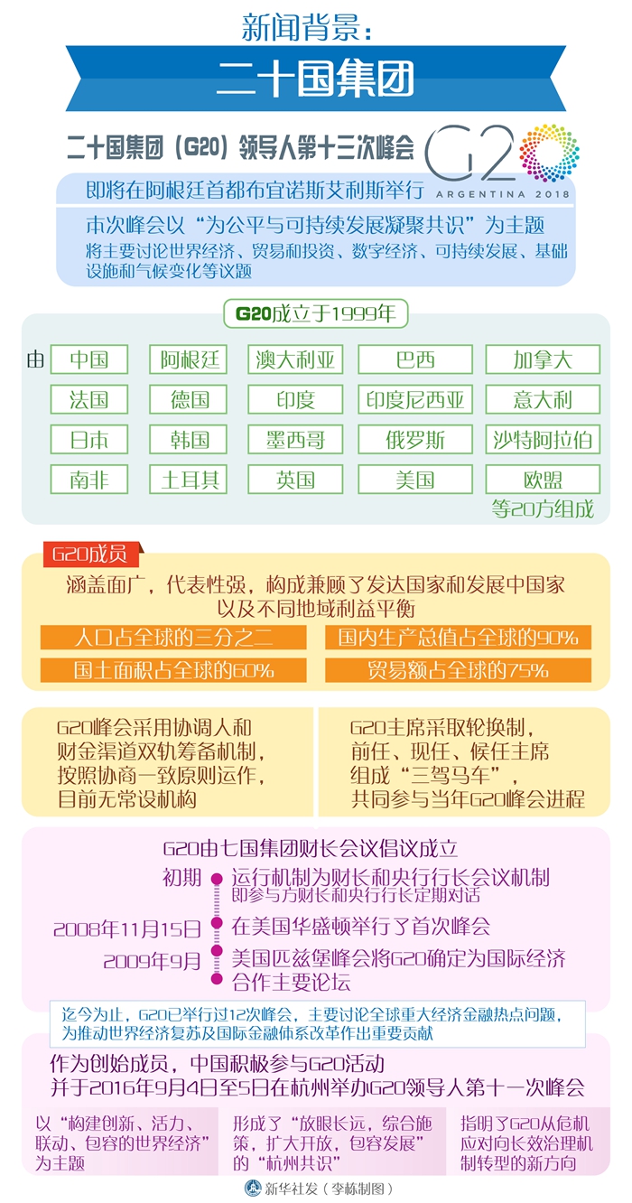二十國集團(G20)領(lǐng)導(dǎo)人第十三次峰會即將在阿根廷首都布宜諾斯艾利斯舉行。本次峰會以“為公平與可持續(xù)發(fā)展凝聚共識”為主題,將主要討論世界經(jīng)濟、貿(mào)易和投資、數(shù)字經(jīng)濟、可持續(xù)發(fā)展、基礎(chǔ)設(shè)施和氣候變化等議題。