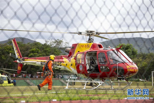 1月26日,在巴西米納斯吉拉斯州布魯馬迪紐市附近的一處救助點,一名消防員在執(zhí)行援救工作的直升機前。新華社記者 李明 攝