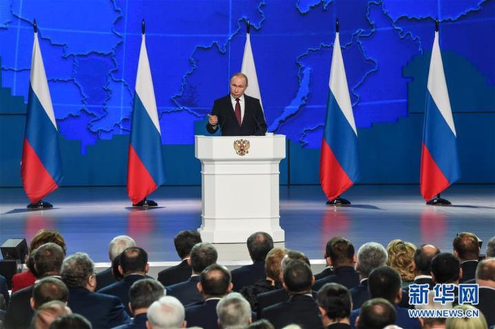 2月20日,在俄羅斯首都莫斯科,俄總統(tǒng)普京向議會(huì)上下兩院發(fā)表國(guó)情咨文。 新華社發(fā)(葉甫蓋尼·西尼岑攝)