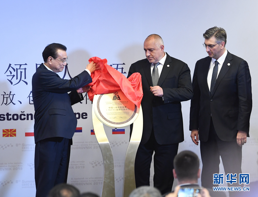 當(dāng)?shù)貢r(shí)間4月12日下午,國務(wù)院總理李克強(qiáng)在杜布羅夫尼克出席第八次中國-中東歐國家領(lǐng)導(dǎo)人會晤后,與保加利亞總理鮑里索夫、克羅地亞總理普連科維奇共同為“16+1全球伙伴中心”揭牌,宣布“16+1全球伙伴中心”正式成立。新華社記者 申宏 攝