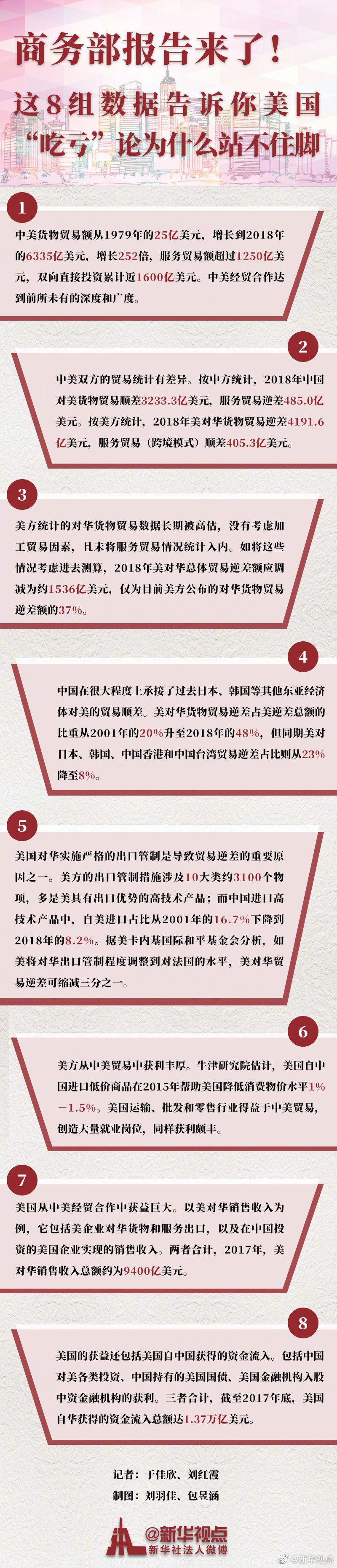 美國(guó)新一屆政府上臺(tái)以來(lái),一直宣揚(yáng)美對(duì)華貿(mào)易“吃虧”論,并以貿(mào)易逆差問(wèn)題為借口,挑起經(jīng)貿(mào)摩擦。真相到底如何?中國(guó)商務(wù)部6月6日發(fā)布《關(guān)于美國(guó)在中美經(jīng)貿(mào)合作中獲益情況的研究報(bào)告》,報(bào)告里的這8組數(shù)據(jù)將讓你看清中美貿(mào)易逆差問(wèn)題的本質(zhì)和成因,以及美國(guó)從中美經(jīng)貿(mào)合作中獲利巨大的事實(shí)。戳圖?