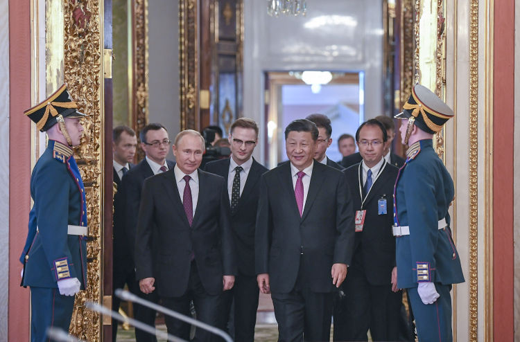 6月5日,國家主席習近平在莫斯科克里姆林宮同俄羅斯總統(tǒng)普京會談。這是兩國元首步入會場。新華社記者謝環(huán)馳攝