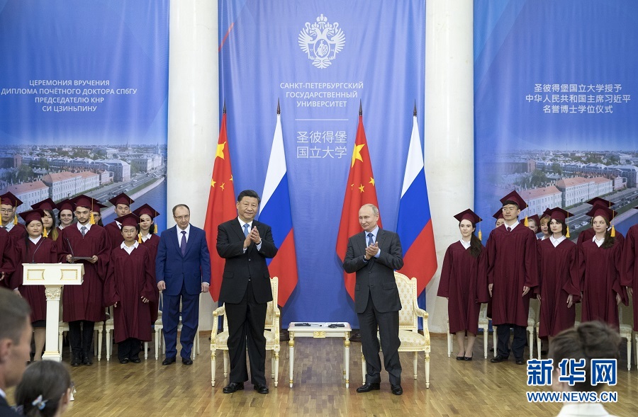 新華社圣彼得堡6月6日電(記者霍小光 呂傳忠)國(guó)家主席習(xí)近平6日在圣彼得堡出席接受圣彼得堡國(guó)立大學(xué)名譽(yù)博士學(xué)位儀式。俄羅斯總統(tǒng)普京出席儀式。