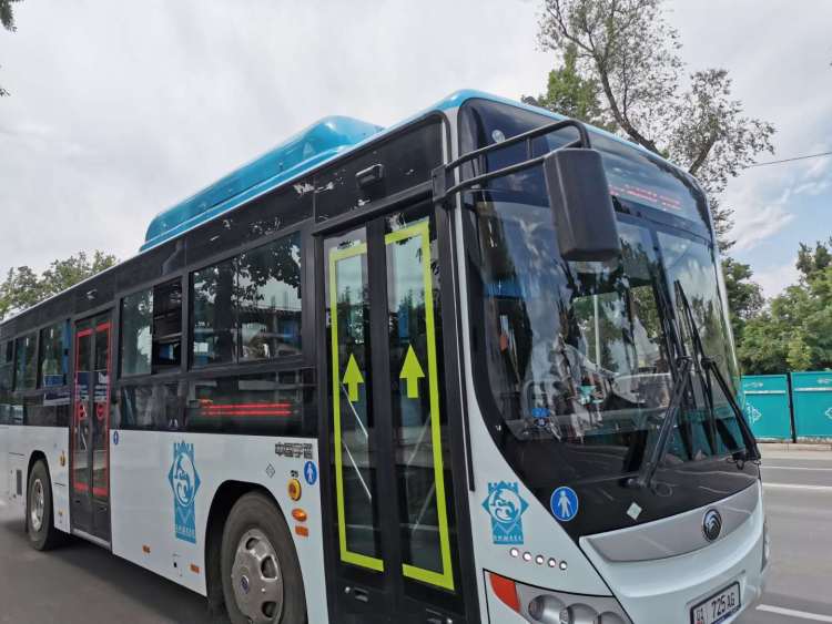 行駛在比什凱克城市干道上的宇通公交車。(新華社記者 王申 攝)
