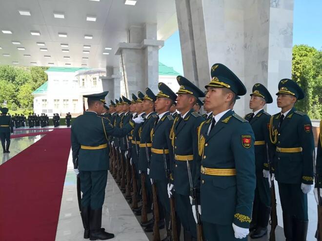 檢閱儀仗隊(duì)時(shí),習(xí)近平主席走到儀仗隊(duì)中央,用吉爾吉斯語向儀仗隊(duì)員問候:戰(zhàn)士們好!儀仗隊(duì)員用吉爾吉斯語回答:歡迎您!