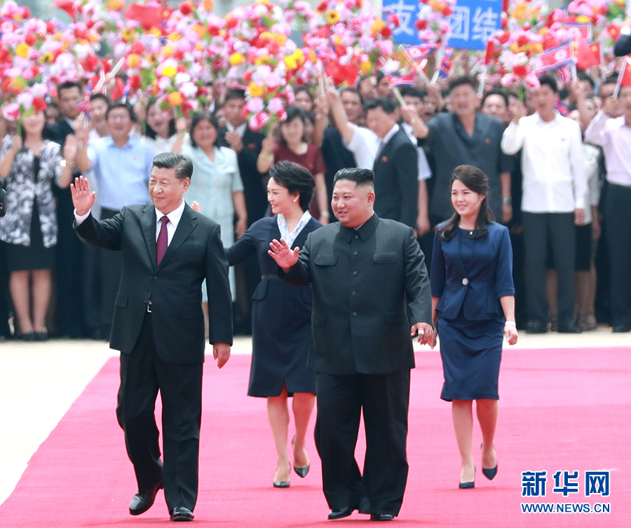 當?shù)貢r間12時許,習近平乘坐的專機抵達平壤順安機場。雨后初晴的平壤,天高云淡、氣候怡人,到處郁郁蔥蔥、繁花似錦,整個城市洋溢著友好熱烈的氣氛。機場上中朝兩國國旗迎風飄揚,“熱烈歡迎中國共產(chǎn)黨中央委員會總書記、中華人民共和國主席習近平同志”“鮮血凝成的朝中兩國人民之間牢不可破的友誼團結萬歲”大幅標語高高懸掛,近萬名群眾排列成整齊的隊伍,有力地揮動著花束,以歡快的口號和熱情的笑容,歡迎尊貴的中國客人到來。朝鮮勞動黨委員長、國務委員會委員長金正恩和夫人李雪主到機場迎接。