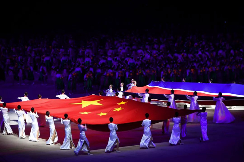 這臺演出為習(xí)近平此訪專門精心創(chuàng)作,數(shù)萬名朝鮮演員參加表演,朝鮮三大樂團(tuán)首次同臺獻(xiàn)藝,整場演出氣勢恢宏、震撼感人。