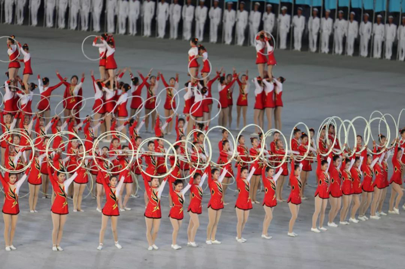 平壤大同江畔,綾羅島“五一”體育場是團(tuán)體操的主要舞臺。演出以朝鮮民族獨(dú)特的“歌舞之美”、富有活力的團(tuán)體操、嘆為觀止的雜技表演,展現(xiàn)出朝鮮革命與戰(zhàn)爭、政治和軍隊(duì)建設(shè)、民生與經(jīng)濟(jì)發(fā)展以及對外交往的宏偉畫卷。