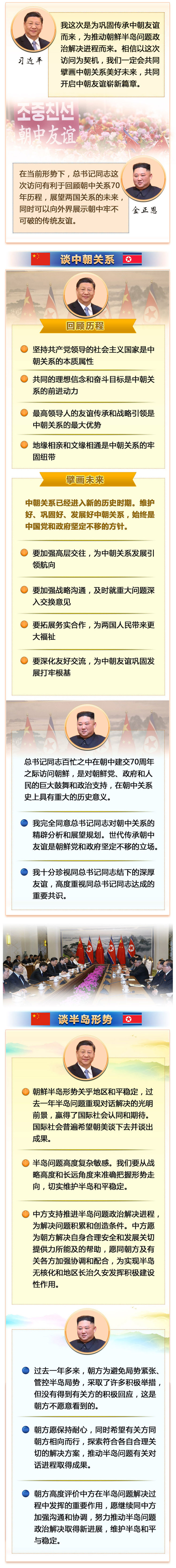 習(xí)近平指出,去年以來(lái),我和委員長(zhǎng)同志4次會(huì)晤,書(shū)寫(xiě)了中朝關(guān)系新篇章,并結(jié)下了深厚友誼。感謝金正恩委員長(zhǎng)同志為我這次訪(fǎng)問(wèn)舉行的隆重而熱烈的歡迎儀式,我今天從下飛機(jī)到抵達(dá)住處,所到之處無(wú)不感受到中朝一家親的濃厚氛圍。今年是中朝建交70周年,在兩黨兩國(guó)關(guān)系發(fā)展史上具有承前啟后、繼往開(kāi)來(lái)的重要意義,我又同金正恩委員長(zhǎng)在平壤會(huì)面。我這次是為鞏固傳承中朝友誼而來(lái),為推動(dòng)朝鮮半島問(wèn)題政治解決進(jìn)程而來(lái)。相信以這次訪(fǎng)問(wèn)為契機(jī),我們一定會(huì)共同擘畫(huà)中朝關(guān)系美好未來(lái),共同開(kāi)啟中朝友誼嶄新篇章。