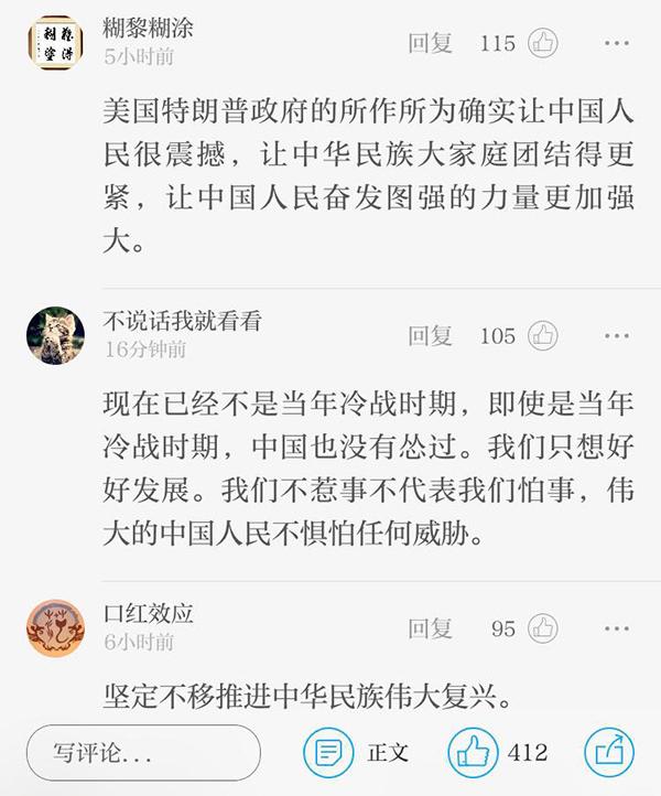 美國特朗普政府的所作所為確實讓中國人民很震撼,讓中華民族大家庭團(tuán)結(jié)得更緊,讓中國人民奮發(fā)圖強(qiáng)的力量更加強(qiáng)大。