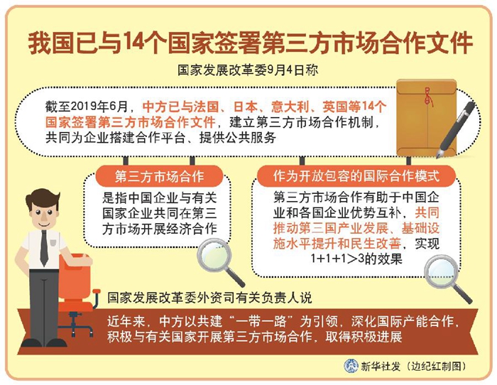 新華社北京9月4日電(記者安蓓)國家發(fā)展改革委4日稱,截至2019年6月,中方已與法國、日本、意大利、英國等14個(gè)國家簽署第三方市場合作文件,建立第三方市場合作機(jī)制,共同為企業(yè)搭建合作平臺(tái)、提供公共服務(wù)。