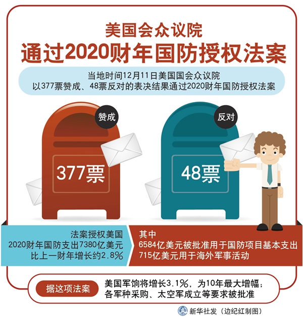 新華社華盛頓12月11日電(記者孫丁 徐劍梅)美國(guó)國(guó)會(huì)眾議院11日以377票贊成、48票反對(duì)的表決結(jié)果通過2020財(cái)年國(guó)防授權(quán)法案。
