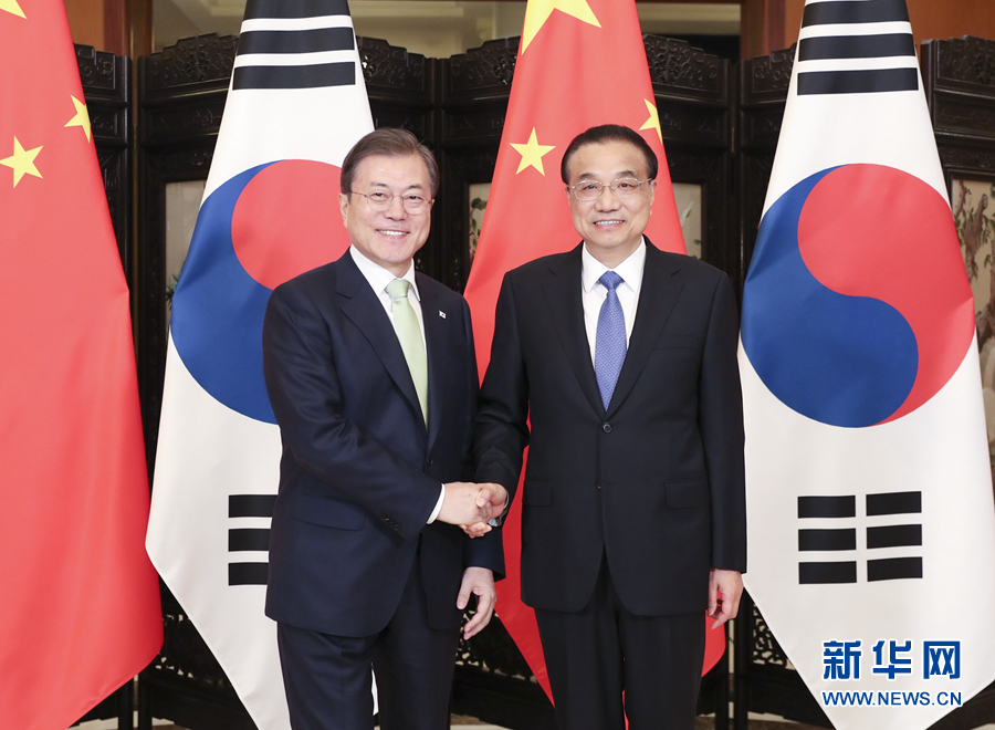 12月23日,國(guó)務(wù)院總理李克強(qiáng)在四川成都會(huì)見(jiàn)出席第八次中日韓領(lǐng)導(dǎo)人會(huì)議的韓國(guó)總統(tǒng)文在寅。新華社記者 丁海濤 攝