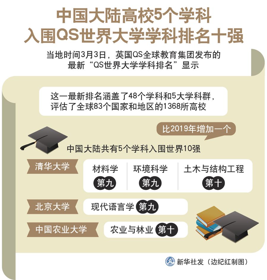 新華社倫敦3月3日電(記者梁希之)英國QS全球教育集團(tuán)3日發(fā)布的最新“QS世界大學(xué)學(xué)科排名”顯示,中國大陸3所大學(xué)的5個(gè)學(xué)科入圍世界10強(qiáng)、18所大學(xué)的100個(gè)學(xué)科進(jìn)入世界50強(qiáng)。