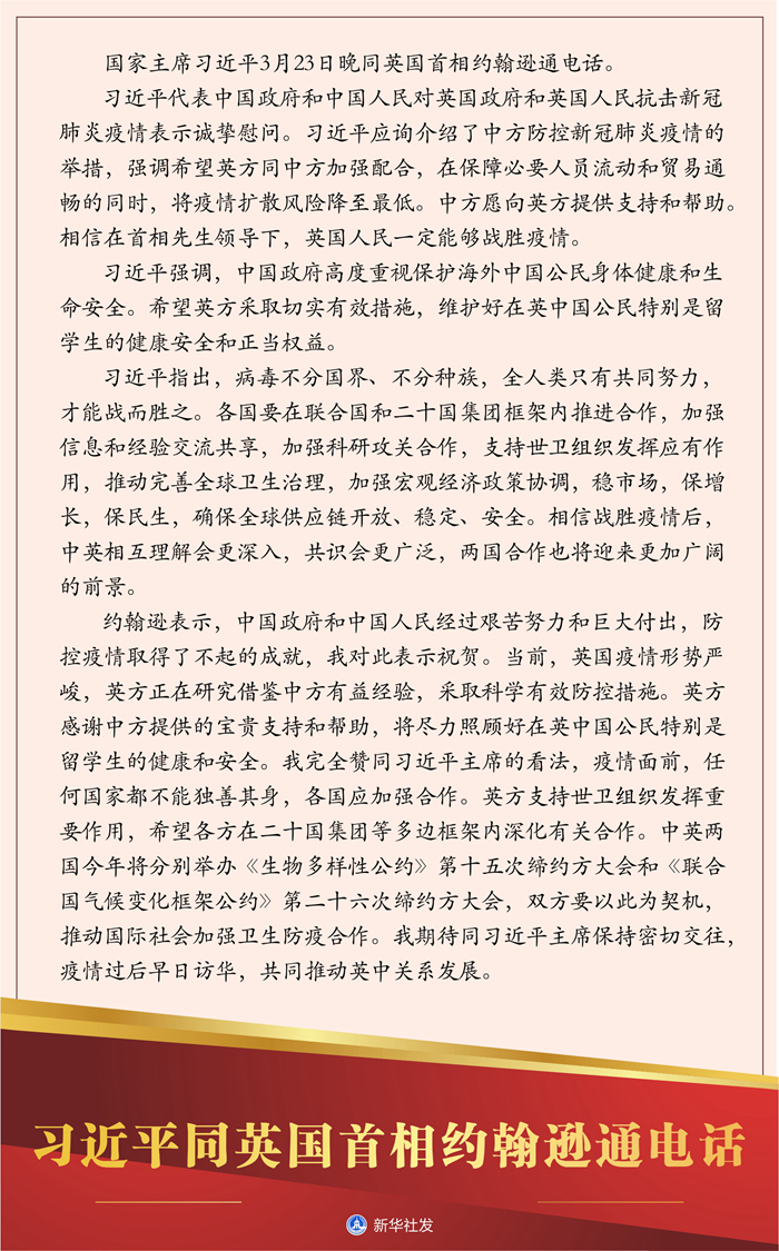 習(xí)近平指出,病毒不分國界、不分種族,全人類只有共同努力,才能戰(zhàn)而勝之。各國要在聯(lián)合國和二十國集團(tuán)框架內(nèi)推進(jìn)合作,加強(qiáng)信息和經(jīng)驗(yàn)交流共享,加強(qiáng)科研攻關(guān)合作,支持世衛(wèi)組織發(fā)揮應(yīng)有作用,推動(dòng)完善全球衛(wèi)生治理,加強(qiáng)宏觀經(jīng)濟(jì)政策協(xié)調(diào),穩(wěn)市場(chǎng),保增長,保民生,確保全球供應(yīng)鏈開放、穩(wěn)定、安全。相信戰(zhàn)勝疫情后,中英相互理解會(huì)更深入,共識(shí)會(huì)更廣泛,兩國合作也將迎來更加廣闊的前景。