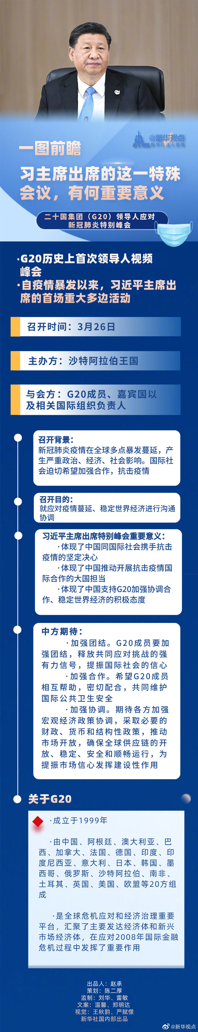 國家主席習(xí)近平將于3月26日出席二十國集團(tuán)領(lǐng)導(dǎo)人應(yīng)對新冠肺炎特別峰會,此次峰會將以視頻的方式舉行。習(xí)近平主席出席此次特別峰會有什么重要意義?