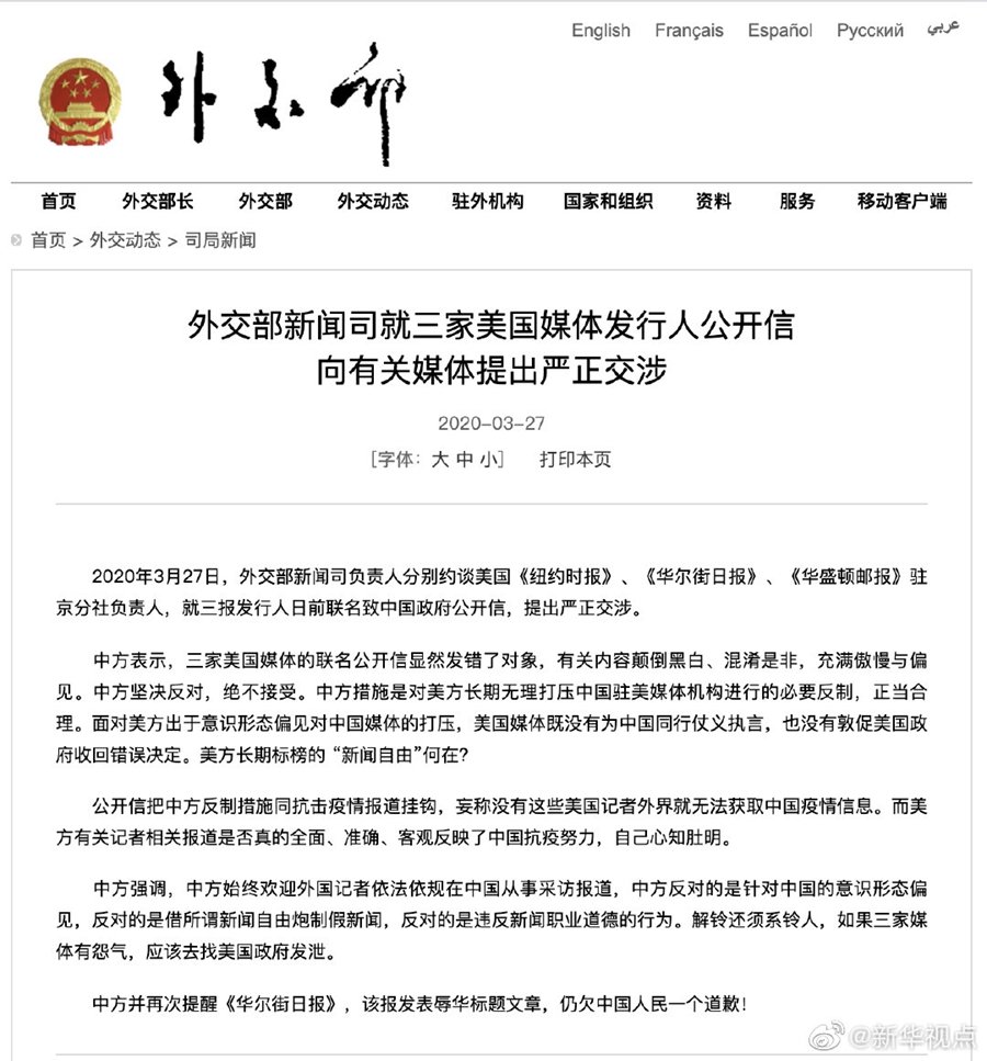 3月27日,外交部新聞司負責人分別約談美國《紐約時報》《華爾街日報》《華盛頓郵報》駐京分社負責人,就三報發(fā)行人日前聯(lián)名致中國政府公開信,提出嚴正交涉。
