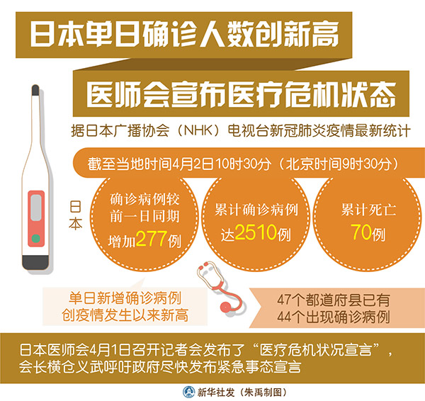 新華社東京4月2日電(記者華義)據(jù)日本廣播協(xié)會(NHK)電視臺新冠肺炎疫情最新統(tǒng)計,截至2日10時30分(北京時間9時30分),日本確診病例較前一日同期增加277例,單日新增確診病例創(chuàng)疫情發(fā)生以來新高。