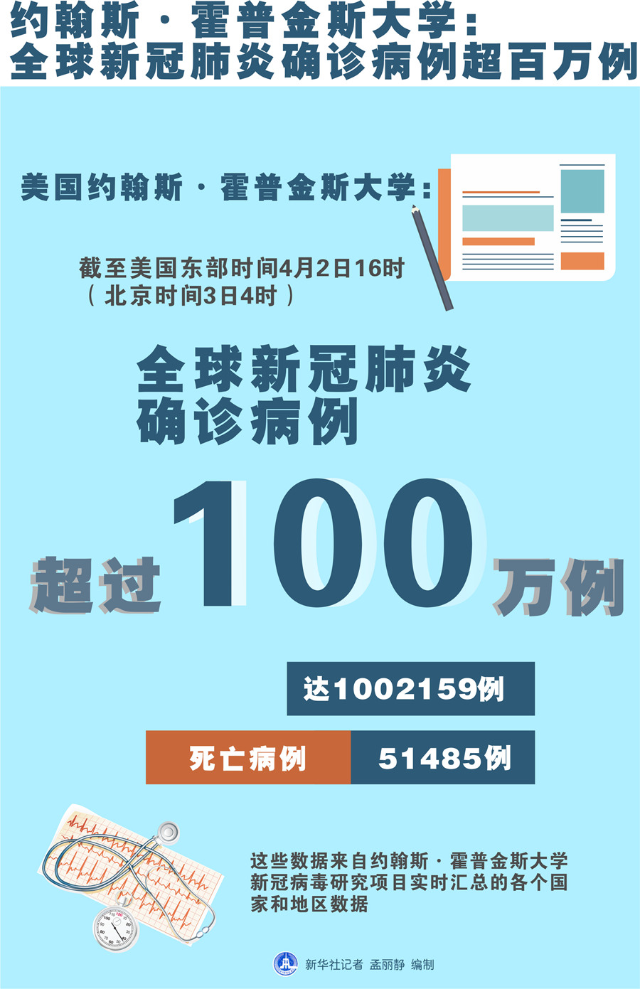 美國約翰斯·霍普金斯大學:截至美國東部時間2日16時(北京時間3日4時),全球確診病例達1002159例,死亡病例為51485例。美國確診病例增至236339例,是目前確診病例最多的國家,其死亡病例為5648例。