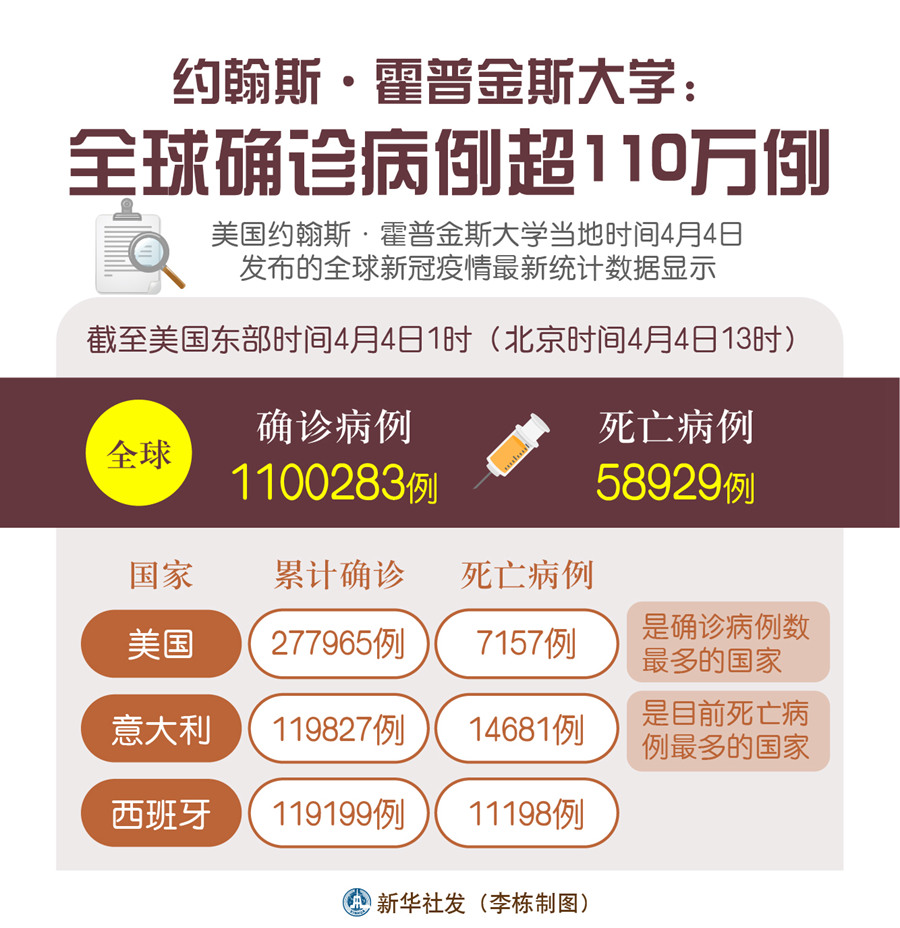 數(shù)據(jù)顯示,截至美國東部時間4日1時(北京時間4日13時),全球確診病例達(dá)1100283例,死亡病例為58929例。