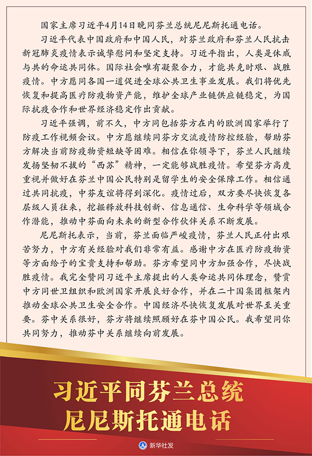 習(xí)近平強調(diào),前不久,中方同包括芬方在內(nèi)的歐洲國家舉行了防疫工作視頻會議。中方愿繼續(xù)同芬方交流疫情防控經(jīng)驗,幫助芬方解決當(dāng)前防疫物資短缺等困難。相信在你領(lǐng)導(dǎo)下,芬蘭人民繼續(xù)發(fā)揚堅韌不拔的“西蘇”精神,一定能夠戰(zhàn)勝疫情。希望芬方高度重視并做好在芬蘭中國公民特別是留學(xué)生的安全保障工作。相信通過共同抗疫,中芬友誼將得到深化。疫情過后,雙方要盡快恢復(fù)各層級人員往來,挖掘釋放科技創(chuàng)新、信息通信、生命科學(xué)等領(lǐng)域合作潛能,推動中芬面向未來的新型合作伙伴關(guān)系不斷發(fā)展。