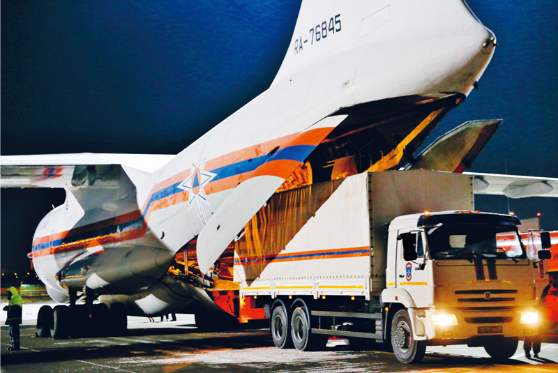 2020年2月8日,在俄羅斯莫斯科附近的茹科夫斯基機(jī)場(chǎng),工作人員將俄羅斯政府向中方提供的醫(yī)療援助物資裝上運(yùn)輸機(jī)。 新華社/衛(wèi)星社