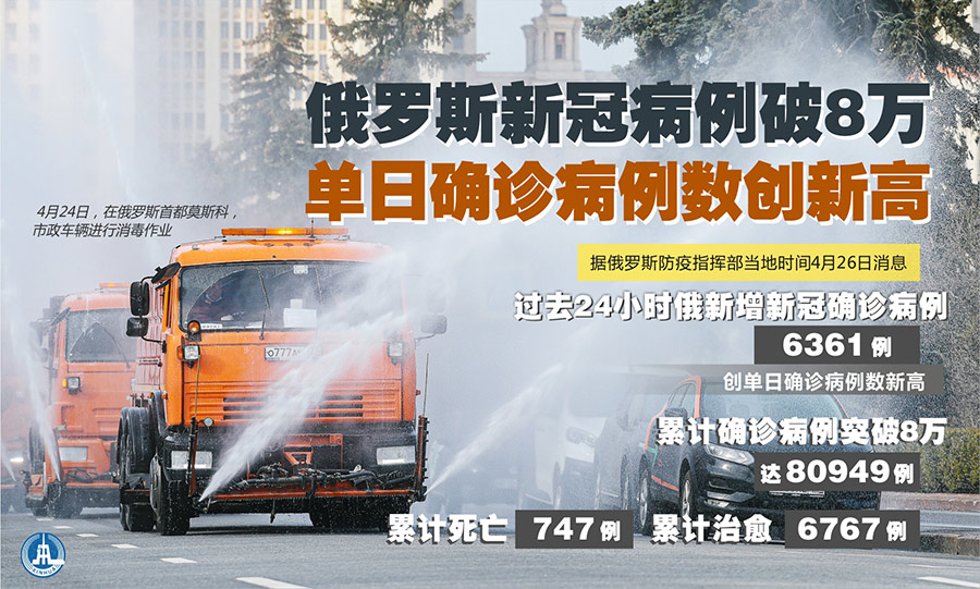 新華社莫斯科4月26日電(記者魯金博)據(jù)俄羅斯防疫指揮部26日消息,過去24小時俄新增新冠確診病例6361例,創(chuàng)單日確診病例數(shù)新高,累計確診病例突破8萬,達(dá)80949例。