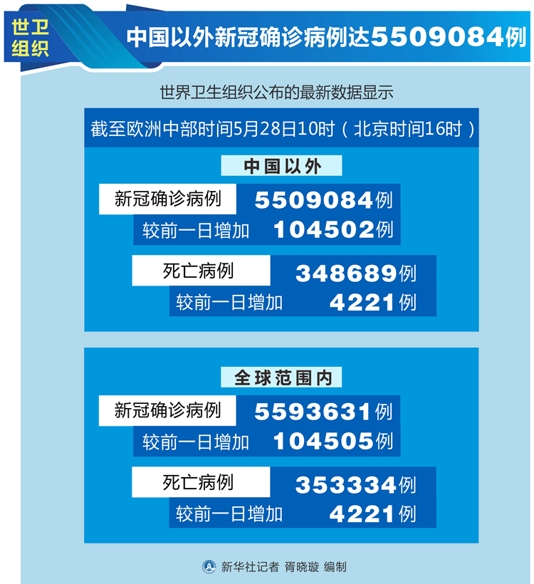 世衛(wèi)組織每日疫情報告顯示,截至歐洲中部時間28日10時(北京時間16時),中國以外新冠確診病例較前一日增加104502例,達到5509084例;中國以外死亡病例較前一日增加4221例,達到348689例。