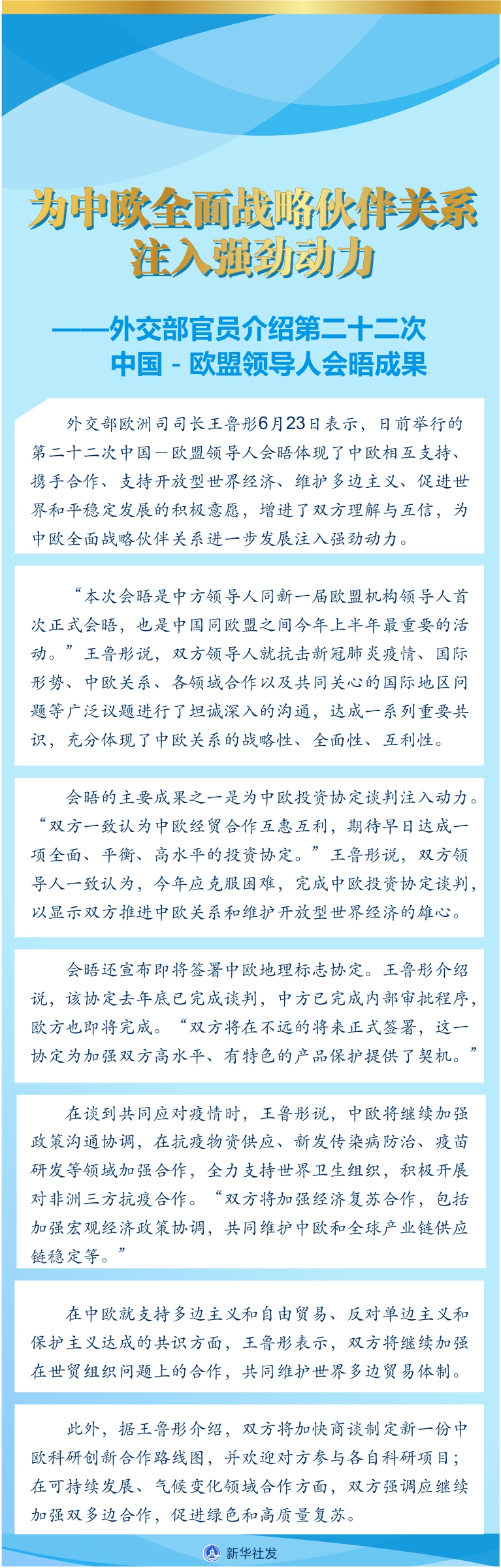 新華社北京6月23日電(記者王賓)外交部歐洲司司長(zhǎng)王魯彤23日表示,日前舉行的第二十二次中國(guó)-歐盟領(lǐng)導(dǎo)人會(huì)晤體現(xiàn)了中歐相互支持、攜手合作、支持開放型世界經(jīng)濟(jì)、維護(hù)多邊主義、促進(jìn)世界和平穩(wěn)定發(fā)展的積極意愿,增進(jìn)了雙方理解與互信,為中歐全面戰(zhàn)略伙伴關(guān)系進(jìn)一步發(fā)展注入強(qiáng)勁動(dòng)力。