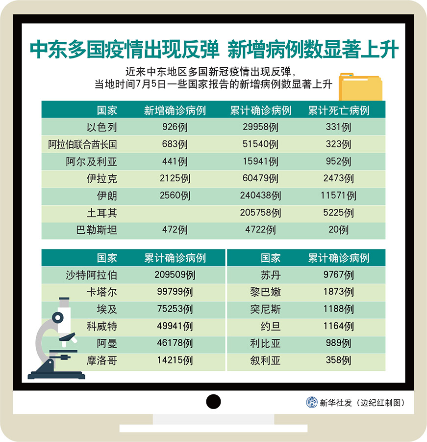 新華社喀土穆7月5日電 綜合新華社駐中東地區(qū)記者報道:近來中東地區(qū)多國新冠疫情出現(xiàn)反彈,一些國家5日報告的新增病例數(shù)顯著上升,多國政府敦促民眾嚴格落實防控措施。