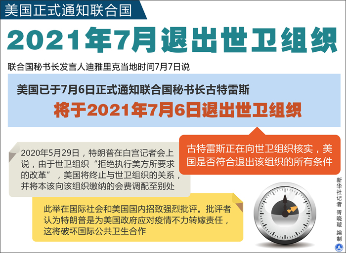 新華社聯(lián)合國(guó)7月7日電(記者王建剛)聯(lián)合國(guó)秘書長(zhǎng)發(fā)言人迪雅里克7日說(shuō),美國(guó)已于6日正式通知聯(lián)合國(guó)秘書長(zhǎng)古特雷斯,將于明年7月退出世界衛(wèi)生組織。