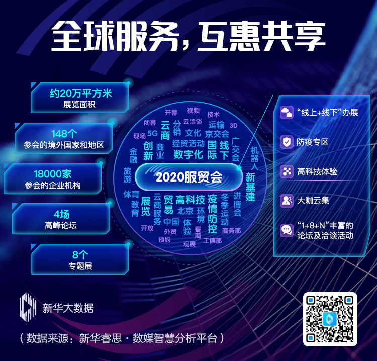 今年展會包括了1個綜合展、8個專題展及若干功能服務區(qū)。其中綜合展包括公共衛(wèi)生防疫專區(qū)、國別和?。ㄗ灾螀^(qū)、直轄市)專區(qū)、服務貿易十二大領域企業(yè)專區(qū);專題展則突出打造文化、金融、冬季運動、旅游、教育、體育、服務機器人和5G通信服務等服務領域行業(yè)特色。