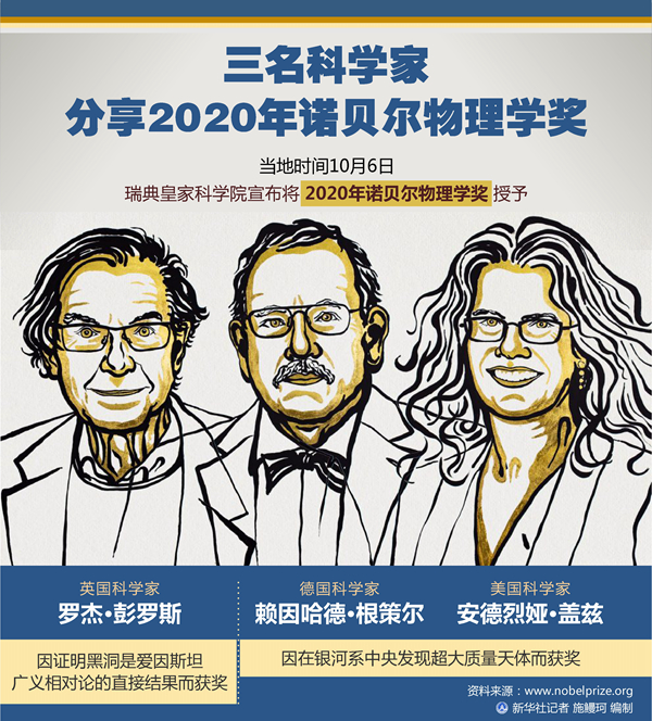 新華社斯德哥爾摩10月6日電(記者和苗 付一鳴)瑞典皇家科學(xué)院6日宣布,將2020年諾貝爾物理學(xué)獎(jiǎng)授予三名科學(xué)家。英國(guó)科學(xué)家羅杰·彭羅斯因證明黑洞是愛因斯坦廣義相對(duì)論的直接結(jié)果而獲獎(jiǎng);德國(guó)科學(xué)家賴因哈德·根策爾和美國(guó)科學(xué)家安德烈婭·蓋茲因在銀河系中央發(fā)現(xiàn)超大質(zhì)量天體而獲獎(jiǎng)。