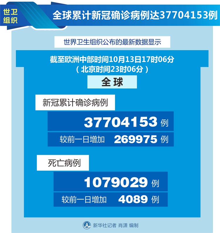 新華社日內(nèi)瓦10月13日電(記者劉曲)世界衛(wèi)生組織13日公布的最新數(shù)據(jù)顯示,全球累計(jì)新冠確診病例達(dá)37704153例。