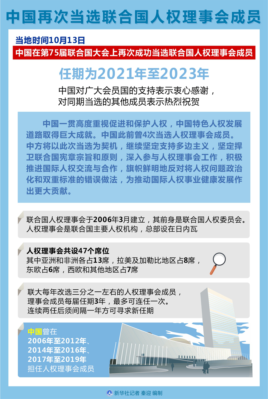 新華社聯(lián)合國10月13日電 10月13日,中國在第75屆聯(lián)合國大會上再次成功當(dāng)選聯(lián)合國人權(quán)理事會成員,任期為2021年至2023年。中國對廣大會員國的支持表示衷心感謝,對同期當(dāng)選的其他成員表示熱烈祝賀。