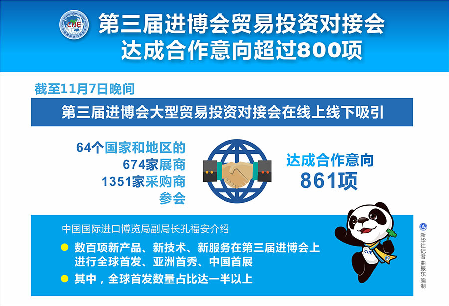 新華社上海11月8日電(記者周蕊、于佳欣)記者8日從第三屆中國(guó)國(guó)際進(jìn)口博覽會(huì)展中新聞通氣會(huì)上了解到,截至7日晚間,第三屆進(jìn)博會(huì)大型貿(mào)易投資對(duì)接會(huì)在線上線下吸引64個(gè)國(guó)家和地區(qū)的674家展商、1351家采購(gòu)商參會(huì),達(dá)成合作意向861項(xiàng)。