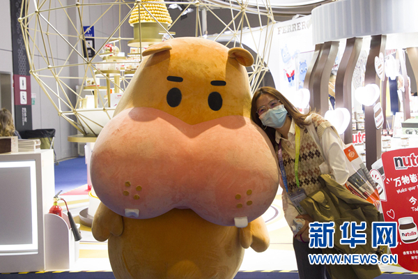 觀眾在第三屆進博會上的食品及農產品展區(qū)與人偶合影(11月5日攝)。新華網 吳一航 攝