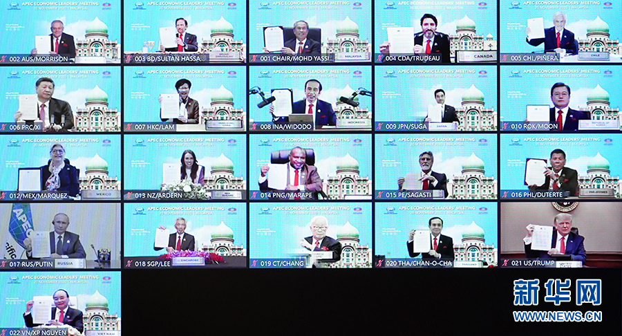 11月20日晚,國家主席習(xí)近平在北京以視頻方式出席亞太經(jīng)合組織第二十七次領(lǐng)導(dǎo)人非正式會(huì)議并發(fā)表重要講話。這是與會(huì)各經(jīng)濟(jì)體領(lǐng)導(dǎo)人、代表通過《2040年亞太經(jīng)合組織布特拉加亞愿景》并線上合影。 新華社記者 李響 攝