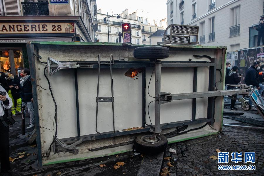 這是11月28日在法國巴黎拍攝的游行示威中被掀翻的車輛。