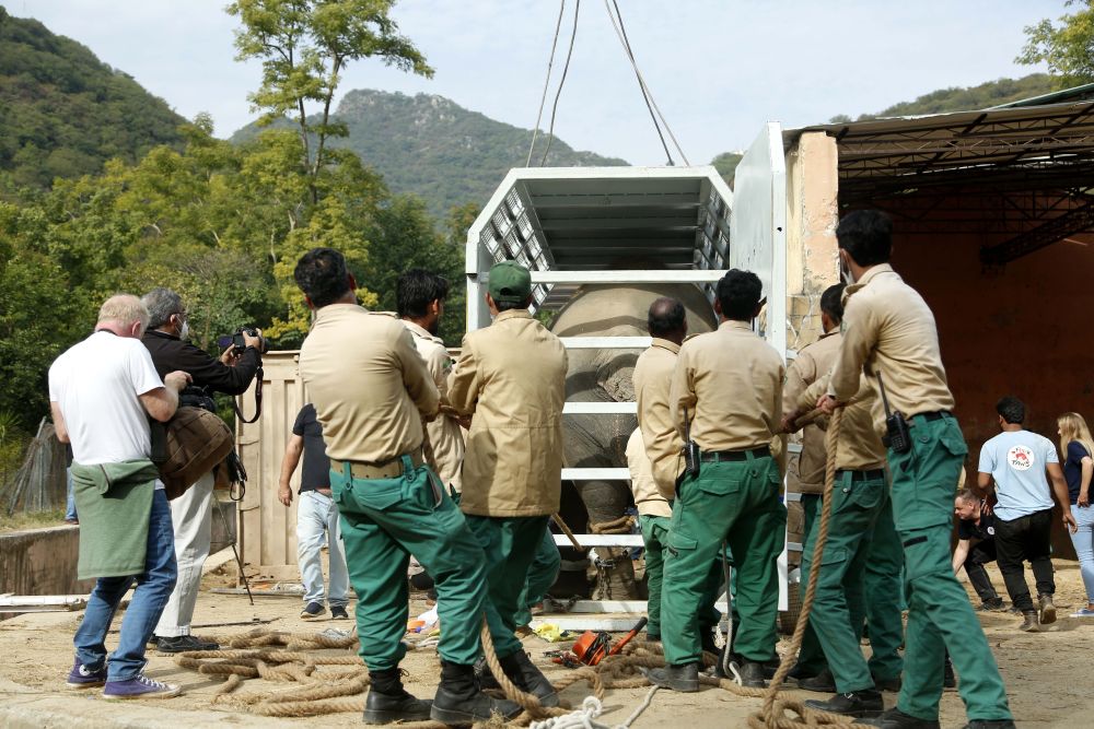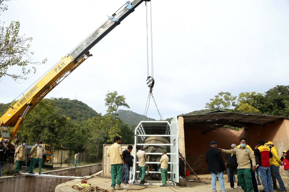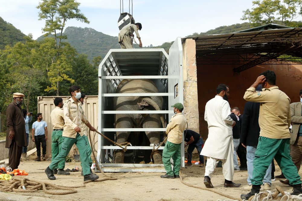 ↑11月29日,在巴基斯坦伊斯蘭堡,工作人員搬運(yùn)裝有大象的運(yùn)輸箱