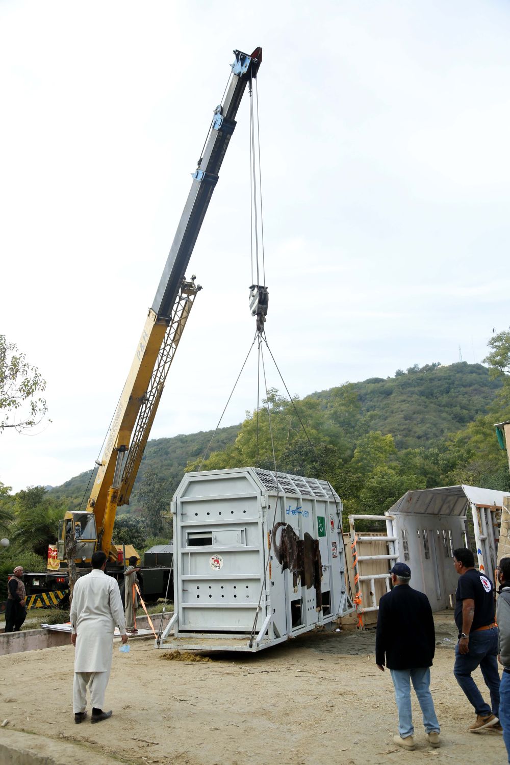 ↑11月29日,在巴基斯坦伊斯蘭堡,工作人員為運(yùn)輸大象做準(zhǔn)備