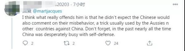 在這條推特下邊,許多網(wǎng)友為馬丁·雅克點(diǎn)贊。其中一位網(wǎng)友說道:“我認(rèn)為真正讓他惱火的是,他沒想到中國人也會(huì)對他們的不當(dāng)行為發(fā)表評論,這是澳大利亞人和其他國家對付中國的慣用伎倆。別忘了,在過去幾乎所有的時(shí)間里,中國都在拼命地進(jìn)行自衛(wèi)。”