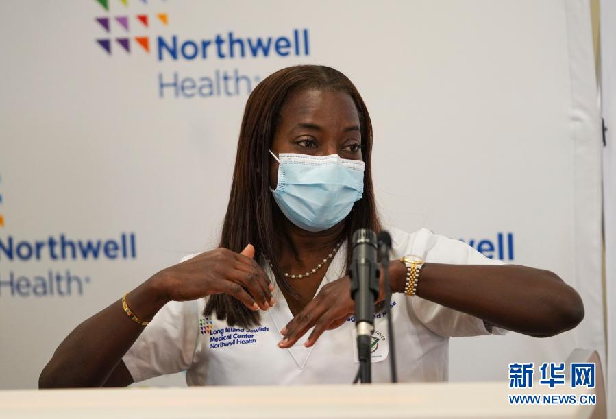 12月14日,在美國紐約,長島猶太醫(yī)療中心重癥監(jiān)護室護士桑德拉·琳賽接種新冠疫苗后參加新聞發(fā)布會。新華社記者王迎攝