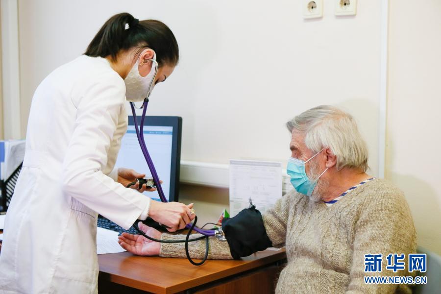 12月30日,在俄羅斯首都莫斯科,醫(yī)護人員在進行疫苗接種前為一名老人測量體溫。新華社發(fā)(亞歷山大攝)