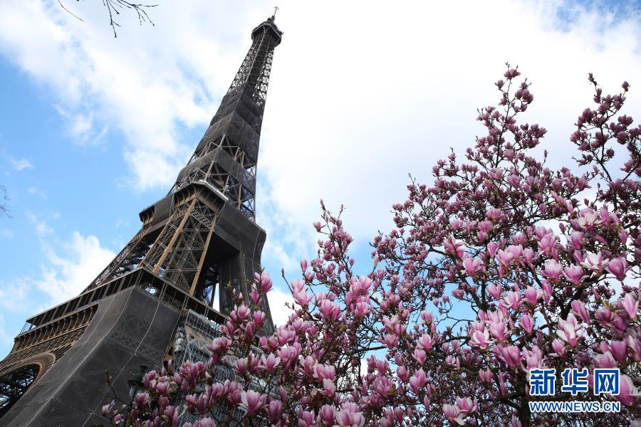 這是3月19日在法國巴黎埃菲爾鐵塔腳下的戰(zhàn)神廣場拍攝的盛放的玉蘭花。新華社記者高靜攝