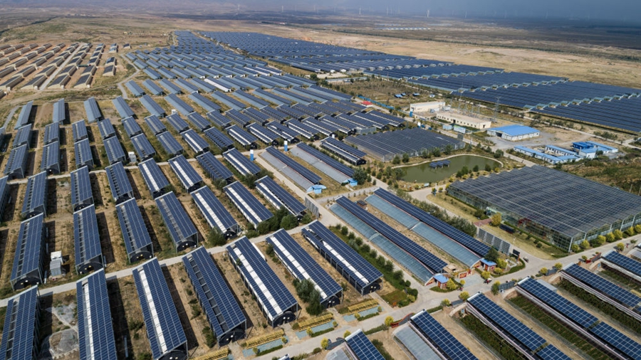 俯瞰寧夏銀川市永寧縣閩寧鎮(zhèn)原隆村的光伏大棚(無(wú)人機(jī)照片,2019年9月3日攝)。(新華社記者 王鵬 攝)