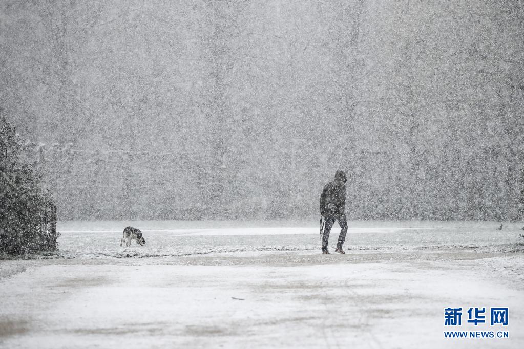 4月6日,一名市民在比利時布魯塞爾五十周年紀(jì)念公園冒雪遛狗。