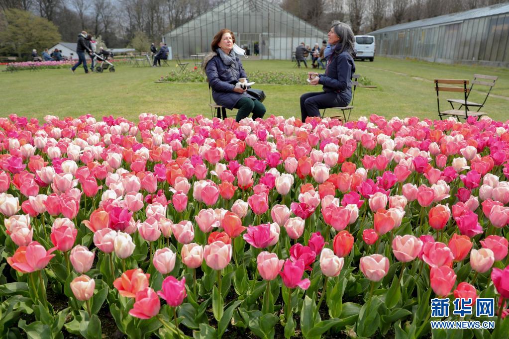 4月14日,參觀者坐在比利時(shí)布魯塞爾以西的拜加登城堡的鮮花旁休息聊天。