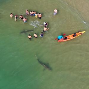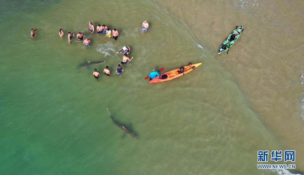 4月20日,在以色列北部城市哈代拉的海邊,鯊魚從人們身邊游過(guò)(無(wú)人機(jī)照片)。