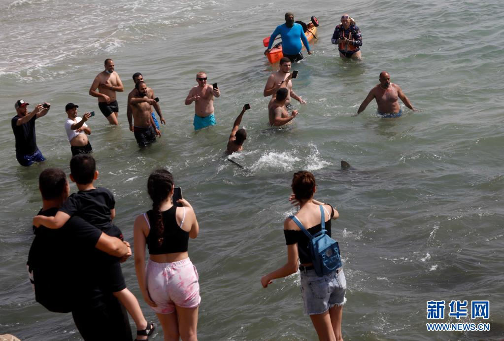 4月20日,在以色列北部城市哈代拉的海邊,鯊魚(yú)從人們身邊游過(guò)。